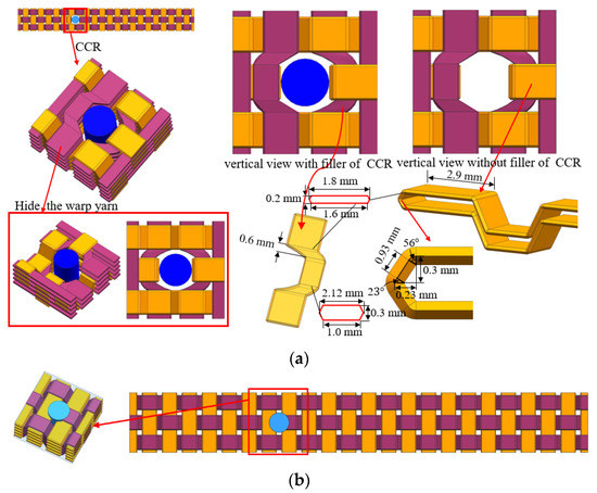 The 2.5D braided CMC plate is composed of matrix and braided fibers. The geometric dimensions of the braided structure in the y-x plane and y-z plane are given in Figure 1b–e. The thickness (H) of the plate is 3.3 mm in the z-axis direction. The length of the plate (L) in the x-axis direction is 23D. In the y-axis direction, the width of the plate (W) is 3D.