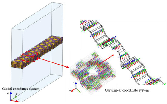 As shown in Figure 2a, during 2.5D braiding, the weft yarns will be deflected in space, which will make the main direction of the weft yarns’ heat conduction mismatch with the global calculation coordinate system. The preformed holes will cause the weft yarn around the film cooling hole to deflect. The deformation also causes the main direction of the heat conduction of the braided yarn to not match the global coordinate system. When the global calculation coordinate system selection is inconsistent with the main direction of heat conduction, the internal temperature field and heat transfer path of the CMC plate cannot be accurately calculated. Therefore, the curvilinear coordinate system is applied in our study to make the main direction of heat conduction constant with the path of the braiding yarn. Figure 6 shows the global coordinates and curvilinear coordinates used in this paper, in which the global coordinates are used for the fluid region and matrix region, and the curvilinear coordinates are used for the braided fibers, where the x direction of the curvilinear coordinates is along the tangent direction of the fiber direction. The anisotropic thermal conductivity of CMC can be calculated accurately by combining Equation (2) with curvilinear coordinates.