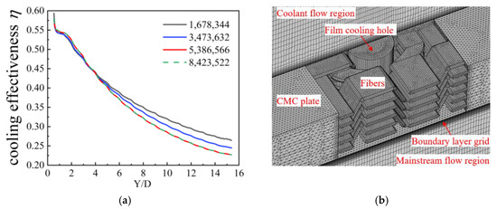 Mixed grids are used for numerical simulation calculations. In the solid region, a tetrahedral grid is used, and then in the mainstream region, the coolant flow region and the film-cooling hole region, the grids on the top and bottom surfaces of the plate are swept to obtain the swept grids. To ensure that the calculation results are independent of the number of grids, this paper divides four sets of grids with the total number of 1,678,344, 3,473,632, 5,386,566, and 8,423,522, respectively, for the verification of grid independence. Figure 8a shows the overall cooling effectiveness under different grid numbers on line 1. The results show that when the number of grids is changed from 5,386,566 to 8,423,522, the change in the overall cooling efficiency is less than 1%. Therefore, a grid with 5,386,566 nodes was used in the simulation, as shown in Figure 8b. In the mainstream flow and coolant flow region, the maximum size of the grid is 0.33 mm, the minimum size is 0.15 mm, and the element size growth rate is 1.1. The height of the first layer of the grid is 1.5 × 10−2 mm, with a total of 15 layers, and the stretch ratio is 1.1. In the film-cooling hole, the maximum size of the grid is 0.1 mm and the minimum size is 0.04 mm, with an element size growth rate of 1.05. For 2.5D braided CMC plates, the maximum size of the grid is 3 mm and the minimum size is 0.1 mm, with an element size growth rate of 1.4.