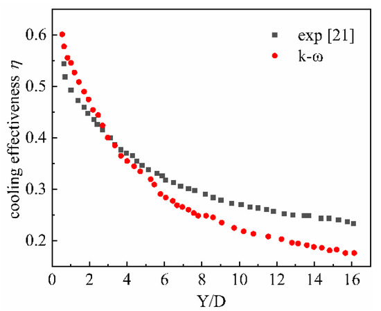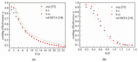 The simulation was carried out with COMSOL Multiphysics 5.4 [32], COMSOL Inc, Stockholm, Sweden. In the CFD (Computational fluid dynamics) model verification, we used the standard k-ε model and the modified k-ω model provided by the software [33]. Based on the models in [34] and [35], adiabatic film cooling simulation is carried out. Figure 9 shows the cooling effectiveness on the centerline of the film-cooling hole downstream and the span-wise line (Y/D = 1) when these two models are used to calculate, respectively. At the same time, the experimental results of the literature [35] and the calculation results of the SSTA model are used in the literature [34].