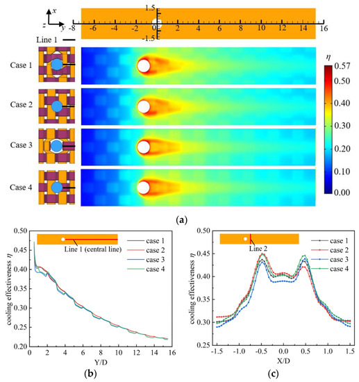 Temperature fields on hot-side wall and cooling efficiencies of cases 1–4: (a) distribution of η on hot-side wall; (b) cooling effectiveness on line 1; (c) cooling effectiveness on line 2.