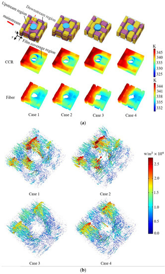Temperature fields and heat flux direction of different cases on CCR: (a) temperature fields of different cases on CCR, (b) flux direction of different cases on CCR.