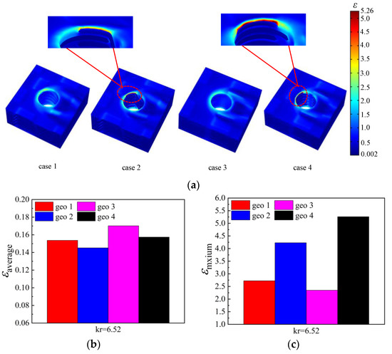 The thermal gradient is an important factor that affects the internal thermal stress of the material, especially for the region with a large thermal gradient near the film-cooling hole. Figure 14a shows the thermal gradient distribution of CCR. It can be seen from Figure 14a that the high thermal gradient mainly exists in the region close to the film-cooling hole. The thermal gradient is low in the middle of the plate and high on both sides. By comparing the four models, it can be seen that the temperature gradient distribution trends of the four models are essentially the same, but compared with case 1 (EP-Hole) and case 3 (WP-Hole), the temperature gradients of case 2 and case 4 around the cut fiber increase sharply. Figure 14b,c show the average thermal gradient and maximum thermal gradient of cases 1–4; it can be seen that different preformed holes have little effect on the average thermal gradient around the film-cooling holes, but have a significant effect on the maximum thermal gradient. The drilled structure will significantly increase the thermal gradient inside the plate. The maximum ε of case 1, case 2, case 3, and case 4 are 2.724, 4.23, 2.35, and 5.26, respectively. Case 2 is 55.3% higher than case 1, and the case 4 is 123.3% higher than case 3. The high temperature gradient is mainly distributed in the area between the broken fiber and the wall, as shown in Figure 14a. In summary, the EP-Hole structure could reduce the average thermal gradient around the flat film-cooling holes, and the WP-Hole could reduce the maximum thermal gradient.