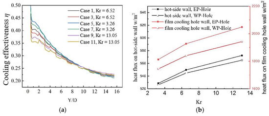 Cooling efficiencies and heat flux: (a) cooling efficiencies of line 1 with different Kr, and (b) heat flux on hot-side wall and film-cooling hole wall of EP-Hole and WP-Hole with different Kr.