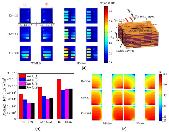 Figure 15b shows the heat flux on the hot-side wall and the film-cooling hole wall of the plates with EP-Hole and WP-Hole under different Kr values. It can be seen from Table 2 that as Kr increases from 3.26 to 13.05, the amount of heat entering the flat plate through the hot sidewall increases. For Geo1, the heat flux of the hot-side wall increased from 528.63 W/m2 to 572.45 W/m2, an increase of 8.29%. For Geo3, the heat flux of the hot-side wall increased from 526.25 W/m2 to 564.96 W/m2, an increase of 7.35%. With the increase of Kr, however, the heat taken away by convection heat transfer through the wall of the film-cooling hole also increased. For Geo1, the heat flux on the wall of the film-cooling hole increased from 1813.1 W/m2 to 2048.4 W/m2, an increase of 12.97%. For Geo3, the heat flux on the wall of the film-cooling hole increased from 1744.4 W/m2 to 1942.5 W/m2, an increase of 11.35%. Therefore, with the increase of Kr, the decrease of η on the hot-side wall is not simply caused by the increase of convective heat transfer on the hot-side wall. Figure 15 shows the heat flux and temperature distribution in section 4. It can be seen from Figure 16a,b that as Kr increases, the heat transferred from the high-temperature region (upstream region) to the low-temperature region (downstream region) increases. The EP-Hole structure increased by 55.5%, and the WP-Hole structure increased by 88.23%. As the upstream injection heat increases, the temperature on section 4 also increases, as shown in Figure 16c. It can be seen that the heat injection increase from the upstream region to the downstream region is another important reason for the decrease of η. This also makes it so that in the downstream of the film-cooling hole, with the increase of Kr, the closer to the film-cooling hole, the more η decreases.