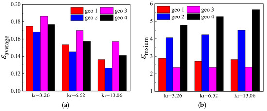 As shown in Figure 17a, in terms of the average thermal gradient, different braided structures have little effect on the average temperature of the plate, compared with the effect caused by Kr. The changes brought about by different braided structures are less than 3.5%, but the average thermal gradient gradually decreases with the increase of Kr, as Geo1–4 decreased by 28.1%, 33.4%, 18.4%, and 25.4%, respectively. Regarding the maximum thermal gradient of the plate, the maximum thermal gradient change is less than 3% for the EP-Hole structure (Geo1) and WP-hole structure (Geo3) caused by different Kr. However, Kr has a significant effect on the maximum thermal gradient of the drilled structure. The increase of Kr will increase the maximum thermal gradient. The maximum thermal gradients for Geo2 and Geo4 increase by 10.7% and 18.8%, respectively, as shown in Figure 17b.