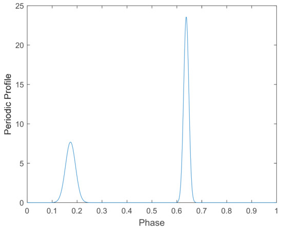 In addition, we investigated the estimation performance of the CE-Adam algorithm for Crab pulsar. Compared with PSR B1821-24, Crab pulsar has a lager flow rate, resulting in much higher CPU time cost. Table 4 shows the simulation parameters of the pulsar [16], and Figure 8 shows its profile. Assuming the observation period is 500 s, the photon TOAs recorded by the orbiting spacecraft are simulated. The objective function of estimating q and f is Equation (5). We compare the estimation performance of CE, DE, PSO, and the CE-Adam algorithm proposed in this paper.