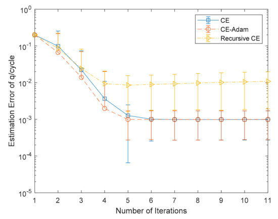 Assuming that the observation period is 1000 s, the photon TOAs recorded by an orbiting spacecraft are simulated. The objective function for estimating q and f is Equation (5). We compare the estimation performance of the CE algorithm, recursive CE algorithm, and CE-Adam algorithm. The average estimation error of q from 1000 Monte Carlo simulations is shown in Figure 4. It can be seen that the estimation accuracy of q for the three algorithms increases with the iterations. The estimation error of q for the recursive CE algorithm is higher than the other algorithms. This is because that the recursive CE algorithm uses a few photons in each iteration, which reduces the estimation accuracy of q. The estimation result for the CE-Adam and the estimation result for the CE algorithm are close to each other. This is because the CE-Adam algorithm overcomes the problem of the recursive CE algorithm and greatly improves the estimation accuracy.