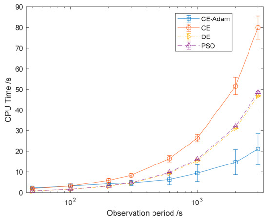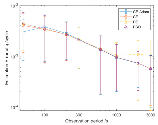 Figure 5 shows the estimation error of q obtained by the four algorithms. It can be seen that the estimation accuracy of q for the four algorithms increases with the increase of the observation period. When the observation period exceeds 1000 s, the estimation error of q of the DE algorithm is higher than PSO, CE and CE-Adam. The estimation error of q for PSO, CE and CE-Adam are close to each other.