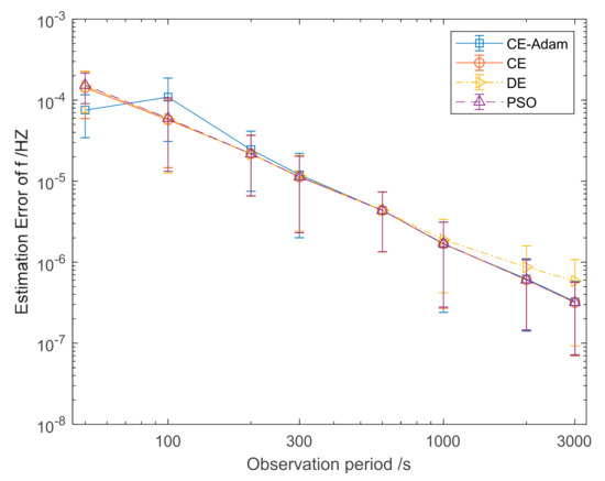 Figure 6 shows the estimation error of f obtained with the four algorithms. It can be seen that the estimation accuracy of f for the four algorithms increases with the increase of the observation period. When the observation period exceeds 1000 s, the estimation error of f of the DE algorithm is higher than PSO, CE and CE-Adam. The estimation error of f for PSO, CE and CE-Adam are close to each other. Table 2 shows the estimation error of q and f. It can be seen that the PSO, CE and CE-Adam perform a lower estimation error than DE. Since the pulse phase estimation is mainly focused on the pulse phase, the estimation of f will not be analyzed in the rest of this paper.
