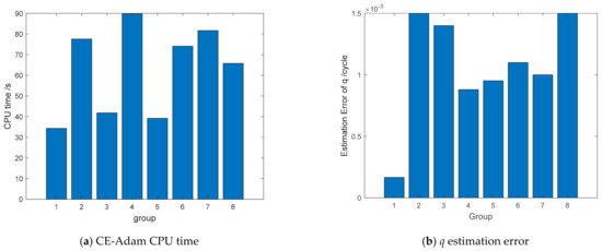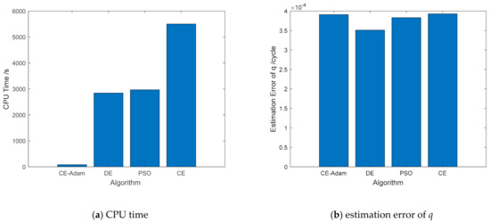Figure 9 shows the estimation error of q and CPU time for the four algorithms. It can be seen that the estimation accuracy of q for the four algorithms is not very different, but the CPU time cost of the CE-Adam algorithm is much lower than the other algorithms. Compared with the CE algorithm, the CPU time cost is about 1.5%; and compared with DE and PSO, the CPU time cost is about 2.8%.