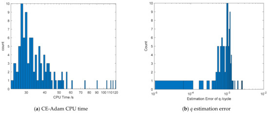 Finding that the CPU time and q estimation error of dataset 1 are both exceptionally low, we used CE-Adam algorithm to process dataset 1 for 100 times. The results of estimation error of q and CPU time are shown in Figure 11. It can be seen that the estimation error of q and CPU time are uncertain. Most results of estimation error of q are about 1 × 10−3, and most results of CPU time are about 30 s. Although the RMS error of q is satisfactory, the uncertainty of the CE-Adam method could impact the estimation of q. Thus, further study is needed to overcome the uncertainty of the CE-Adam method.