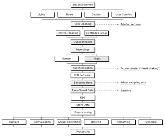 The EEG and GSR devices used in this work have also embedded accelerometers, which they were used to capture the head shaking (placed on the head back) of the volunteers during the flight. The head shaking represents a signal like a wave “mark” used in the further data split process. It was used in four different moments of the experiment: double head shaking to indicate the beginning of the eyes-closed baseline; double head shaking to indicate the end of this baseline; double head shaking to indicate the beginning of the flight (i.e., takeoff); and double head shaking to indicate the end of the flight experiment.