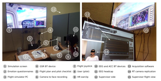 A multisensing approach can also be applied in several research contexts, for instance, in aviation, using flight simulations [7]; using summarizing functions of complementary visual descriptors for video modeling [17]; identification of cognitive states of aircraft pilots while they are using flight simulators [18,19]; and testing the usefulness of psychophysiological measurements in a bio-cooperative feedback loop to adjust the difficulty of an upper extremity rehabilitation task [20].