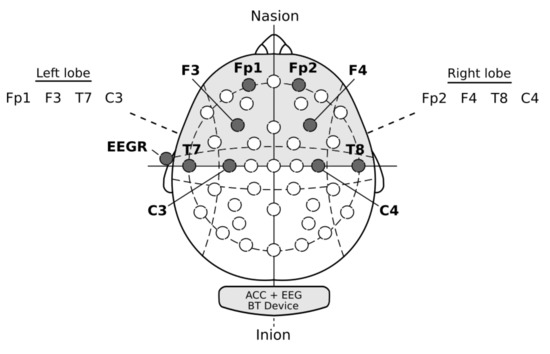 The 10–20 system or International 10–20 system was the method used to describe and apply the location of scalp electrodes. This way, to better detect emotion, alertness situations and cognition artifacts of the scalp, the electrodes were placed on that recommended areas [10,24,25], some of which were also used by [18,19] in other simulated flight experiments: Fp1 (channel 1), F3 (channel 2), C3 (channel 3), T7 (channel 4), Fp2 (channel 5), F4 (channel 6), C4 (channel 7) and T8 (channel 8). The EEG reference electrode (EEGR) was placed on the volunteers’ earlobes [22,26] (Figure 5).