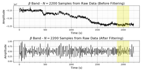 The raw EEG dataset presented many signal fluctuations and some motion artifacts during the experiment, caused mainly due to the head movements. These fluctuations and artifacts change the absolute signal amplitudes and must to be removed. One of possible methods to correct it is based on detrend (or drift removal) using small recursive filter called dc blocker. It is an efficient method and preserves the main characteristics of each peak shape and removes the dc-component of a signal [31]. Other filtering was also applied to consider only the -band on these experiments. The frequency range between 12 and 40 Hz was applied using a band pass filter (BPF) to ensure a minimum noise over the -band (Figure 6).