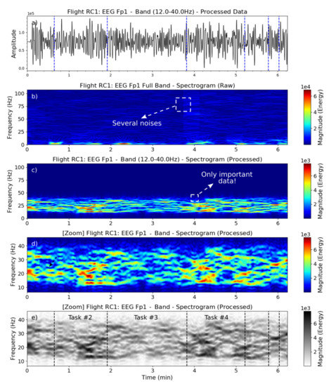 Spectrogram of the flight dataset RC1-frontal left lobe (Fp1). (a) Processed 12–40 Hz data; (b) Raw data spectrogram; (c) Spectrogram of the processed 12–40 Hz data; (d) Processed data on delimited Y-axis; (e) Grayscale spectrogram with tasks delimitation.