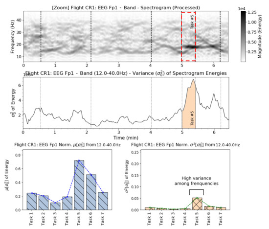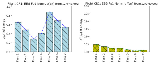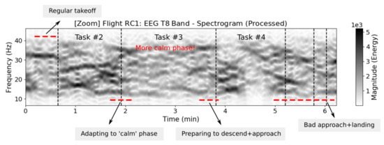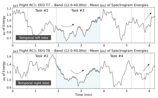 To try to relate the volunteer brain activities according to each flight task, the EEG spectrogram was considered over the -band, showing different magnitudes, according to each flight task. Based on Figure 8d,e, it is possible to note lower magnitudes during task 3, which it corresponds mainly to frequency intervals between 12 and 30 Hz, which it may also indicate a relaxation of the beta brain activity and thus also of the volunteer, due to the low complexity of the present task.