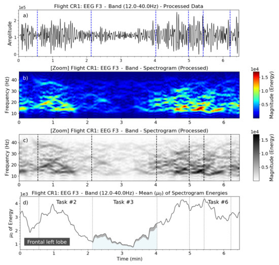 Spectrogram of the flight dataset CR1-frontal left lobe (F3). (a) Processed 12–40 Hz data; (b) Spectrogram of the processed 12–40 Hz data; (c) Grayscale spectrogram with tasks delimitation; (d) Mean of spectrogram energies.