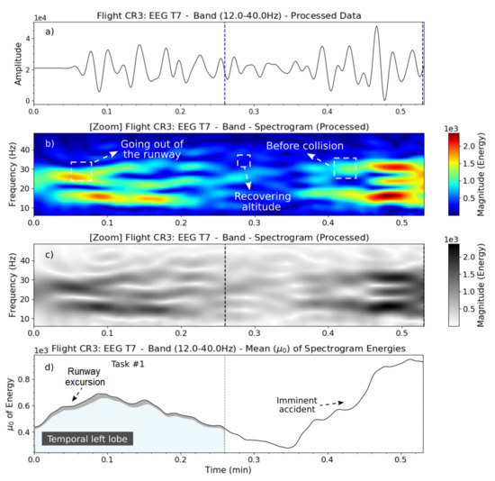 Regarding to the temporal left lobe (channel T7), the spectrogram of this flight clearly shows the brain activity just after the volunteer lost the aircraft controls and before the collision, with some trees over the airport area. For almost 8 s, the volunteer thought to get the airplane’s controls again; probably for this reason, we can see a short period of lower brain magnitudes at the middle of the spectrogram (Figure 12b–d). Unfortunately, the accident occurred just few seconds after.