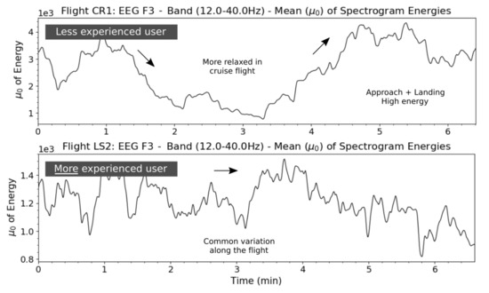 Considering a healthy volunteer, spectrogram analysis was used to show important information, e.g., to try to answer some questions like “how calm were the volunteers when facing some flight situations or moments?”, or “how was the volunteer’s biological reaction throughout the flight?”. The obtained data showed a direct relation between the volunteers’ expertise (or their confidence on flight simulation) and the observed amplitude and oscillation of their brain activity during the flight. The experiment also showed that more experienced and confident volunteers in the proposed flight tasks presented, in general, different patterns of brain activities compared to volunteers with less expertise or less familiarity with fight simulations and/or electronic games.