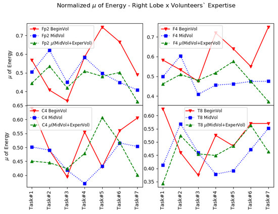 By observing the temporal brain area (channel T8) of the same volunteer (flight RC1), it was also possible to see the brain responses during the flight (Figure 9). It is interesting to analyze the feelings of the volunteers (e.g., by using questionnaires), just after they started a cruise flight (task 3), which it came after a situation that was more intense (higher brain activity) due to problems during the climb task, in which they experienced a more stabilized flight; in the same way, when the volunteer felt that they were close to the start of the descent of the aircraft (task 4), the brain activity (from frontal lobe Fp1 and temporal lobe T8) was shown to increase again, reflecting that the volunteer started to be alert (or even stressed) to execute the next task.