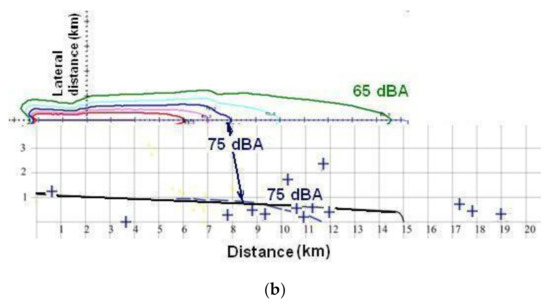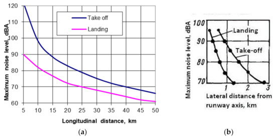 Dependence of noise level LAmax with distance for departure (blue) and arrival (magenta) flight paths [15]: (a) longitudinal dependence, the departure from runway end of roll during take-off; arrival from the runway end of landing; (b) lateral dependence.
