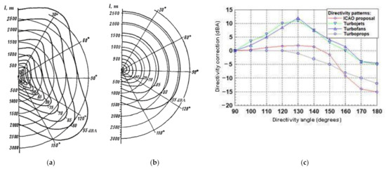 Aircraft engine directivity pattern. Where: (a) Turbojet and turbofan with small by-pass ratio engine [15]; (b) Propeller and turboprop engine [15]; (c) Comparison with ICAO Doc 9911 for the backward direction.