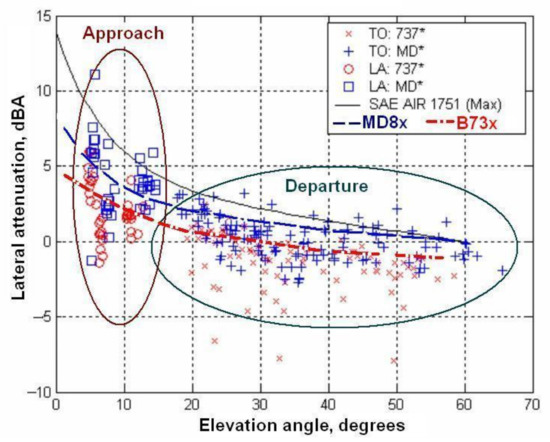 Lateral attenuation due to SAE Standard AIR1751A [18] was processed and presented in a way how overall aircraft noise is attenuated to the side of the aircraft flight pathrelative to the level directly beneath it. The standard equation was derived empirically from a large set of flight noise data based on aircraft types with ICAO Chapter 2 acoustic performances, including and predominantly with tail-mounted engines such the Boeing 727, Lockheed L-1011, Falcon 20, Falcon 50, Douglas DC-9, Douglas DC-10, etc., [18]. The equation for lateral attenuation presented in Standard AIR1751A is calculated as a function of lateral distance d and elevation angle β only [18]—without any difference to the spectrum of noise generated by aircraft and to a surface covering performances over which the effect is observed. This lateral attenuation model is considered as still reliable by SAE 1845A [17] and ICAO Doc 9911 [1], especially for aircraft with tail-mounted engines (Figure 4) but the latest SAE Standard AIR-5662 [19] method recognizes that part of this “lateral attenuation” is, in fact, a lateral directionality associated with engine installation effects. Measurement results even show an amplifying effect for bigger elevation angles as for departures, so as for arrivals. This suggestion was proved the experimental data of the engine installation effects investigation [20] showing the significant differences in the engine installation component of lateral attenuation between jet airplanes with wing-mounted engines and jet airplanes with tail-mounted engines. Possible reasons for these differences are related to the differences in physical geometry of these two groups of airplanes.