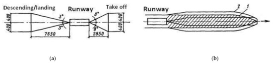 Construction of noise restriction zones taking into account the possible deviation of aircraft from standard route [15]: (a) the corridors for departure and arrival; (b) noise contours: 1—for the nominal route; 2—with an account of possible deviation of aircraft from the nominal route.