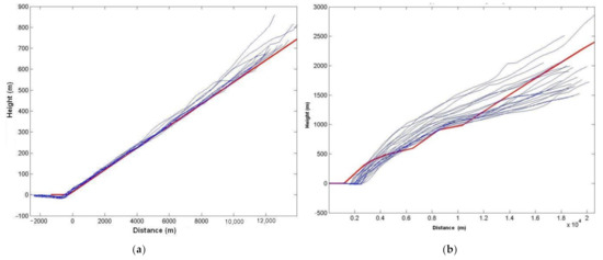Flight profiles (height via distance) observed in operation (blue-colored) in comparison with balanced prediction (red-colored) [21]: (a)—arrival; (b)—departure.