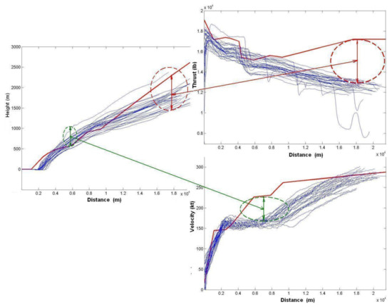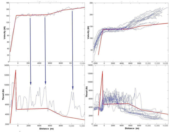 In Figure 9 (combined from four figures, which were taken from [21]) the data for arrivals for two types of aircraft are shown. If to look at the flight speed (on the top of Figure 9) it should be found that operational speeds (blue lines) vary along the glide path and sometimes their values may be reduced below the flight safety requirements (value of balanced flight solution, which is defined in accordance with safety requirements also, is shown as a red line in Figure 9 at the top-left picture). In these cases a pilot must operate with thrust, making engine operation mode higher, trying to return the speeds to the safe values–so in reality we must consider overbalanced thrusts (due to flight control from pilot to return the velocity into safe diapason—by arcs every reduced velocity in the top left picture is connected with an increased thrust of the engine in the bottom left picture in Figure 10). It was found that the thrusts may be two-times higher than the balanced predictions for them. For some types of aircraft, the balanced predictions were found much less than observed thrust in operation (Figure 10, on the right), which may be accessed as a mistake in input values for coefficients (aerodynamic or thrust) in used databases.