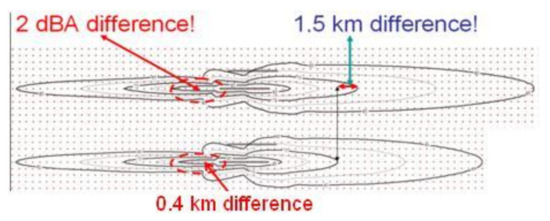 From an acoustic phenomenon only it is somewhat difficult to accept that if one is 400 m out to the side of an aircraft flight path and the aircraft is only several tens of meters above the ground surface or less, that one could expect an additional attenuation in the order of 10 dB (A) would result from ground effect—a calculation scheme for this phenomena is shown in Figure 14a. It is somewhat even more difficult to accept that, if one considers the same horizontal position but now increase the aircraft to few hundreds of meters above ground level that there would be excess attenuation across the ground in the order of 7 dB—these values are provided by the method incorporated in current standards and recommendations [1,13,17,19].