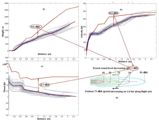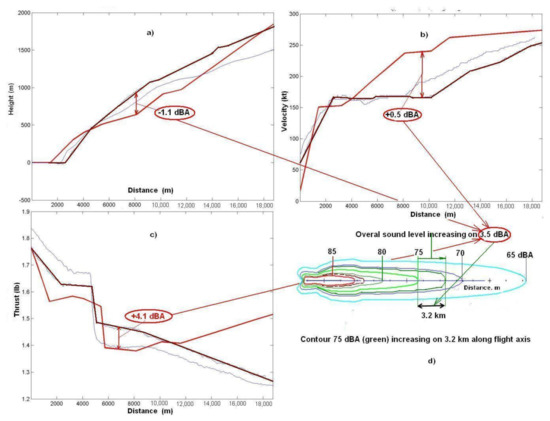 Contributions of the inaccuracy in calculation of the flight profile parameters in an overall calculation accuracy of the sound levels and noise contours for MD-81 departure. The flight data for the figure is used from [21]: (a)—flight path height contribution; (b)—flight path velocity contribution; (c)—flight path thrust contribution; (d)—overall sound level is rising on 3.5 dBA and noise contour 75 dBA increasing on 3.2 km along the axis of departure.