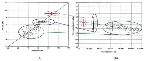Comparison between measured and INM 5.1a calculated SEL for B-733 (combined from the figures, which are taken from [26]): (a)—correlation between the measured and calculated data; (b)—overcalculation as a function to track distance.