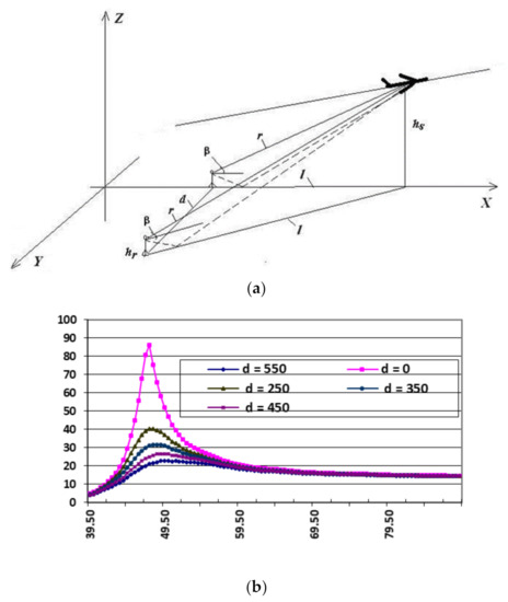 Elevation angle for point of noise measurement beneath and lateral to flight path: (a)—scheme to define the elevation angle β and distance l to the noise source; (b)—dependence of elevation angle β from the lateral distance d (in meters).