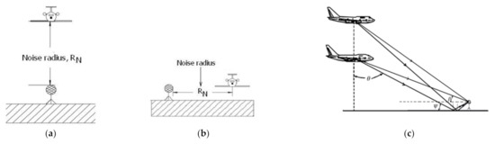 Elevation angle for point of noise measurement beneath (a) and lateral (b) to the flight path, and ahead of the airplane (c) in the vertical plane: β—the elevation angle, θ—incidence angle, ψ—grazing angle and distance R to the noise source.