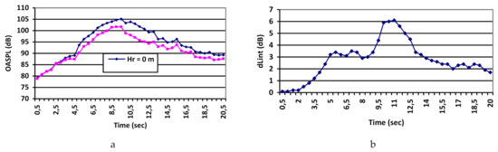 Sound interference effect (or ground effect) measured beneath the take-off/climbing trajectory: (a) overall sound pressure levels dependence with (for the microphone at height Hr = 1.2 m) and without (for the microphone at height Hr = 0.0 m) ground effect; (b) ground effect d Lint itself.