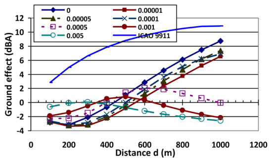 The last point of concern about the accuracy of ground effect assessment in any possible condition—how the wind speed gradient along the height over the ground surface and direction of the wind and also the temperature gradient influence the sound refraction between the aircraft (source) and point of noise measurement (receiver). With positive sound refraction (the sound speed increases with the altitude-sound waves are refracted down to the ground) ground effect may decrease, with negative (the average sound speed is decreasing with altitude, typically at daytime)—increase, in both cases the influence of sound incidence angle change will be most essential for total ground effect change. The influence of sound rays refraction on the ground effect was studied and it is shown in Figure 17 for sound speed gradient change in a range 0–0.005 s−1, it can be seen that for its positive value the ground effect decreases with increasing gradient: within the influence of the temperature gradient (a = 0.00001–0.0005 m−1) by 1–2 dBA, in the presence of wind (a = 0.001–0.005 m−1) downwards the propagation of sound, the effect may be at the level of its neglecting.