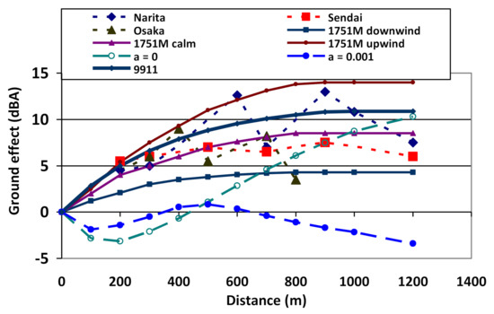 Figure 18 show a comparison of estimated from four airport’s short-term measurements of lateral attenuation of ground-to-ground (LA/GTG) sound propagation (source of noise is located on the ground, as a receiver microphone) with the calculated values of ground attenuation for NOITRA model with (a > 0) and without refraction (a = 0) and for equation from SAE AIR5662 [28]: for wind conditions “Upwind”, “Calm” and “Downwind”, respectively. The measurements were done similarly to noise trials at Figure 17—by microphones at Standard height 1.2 m and close to surface ~0.0 m, where interference effect or ground attenuation was defined by the difference between the measured values. SAE AIR5662 [19] does not include 1.5 dB of engine installation effects for airplanes with wing-mounted jet engines. The measured data for ground attenuation are located between the “Upwind” and “Downwind” calculation curves from [29], closely to “Calm” curve, which provides smaller values in comparison with current ICAO Doc 9911 [1].