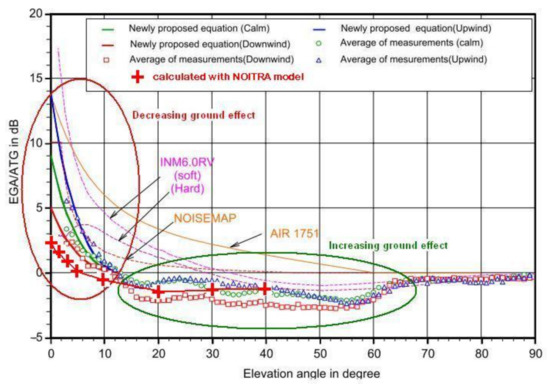 Results of the average of estimated EGA/ATG respectively for the three wind conditions (upwind, calm, and downwind) [28] compared with EGA/ATG value from standards [18,19]: ground effect decreasing the overall sound level is observed for elevation angles β < 12°; for higher elevation angles (12° < β < 70°) the ground effect may increase the overall sound level at the point of noise control.