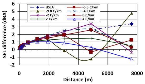 Under conditions of the inhomogeneous atmosphere, the influence of different profiles of temperature, pressure, humidity with altitude on the values of NPD-data for different spectral classes from the ANP database: for conditions of the standard atmosphere (GOST 4401-81) with a vertical temperature gradient −6.5 °C/km and the dependence of atmospheric sound absorption in accordance with GOST 31295.2-2005 (ISO 9613/2), the calculated values differ from the tabular ones on average up to ±2 dBA (Figure 20), their difference from other possible vertical temperature gradients in the atmosphere is insignificant. Influence of changes in the vertical humidity profile (in the range of 30–85% on the ground surface and up to 1% at the height of the maximum distance used in ANP database) from the values of GOST 31295.2-2005 and with constant temperature along the height over the ground surface—within ±1 dBA.