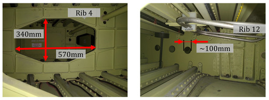 A detailed view of the structural environment of an Airbus A320 wing fuel tank is illustrated in Figure 2 with exemplary chambers from a fuel tank demonstrator at the Lufthansa Technik base in Hamburg, Germany. The left image shows a hole within the fourth rib of a tank chamber. Here, the MRO staff must crawl through to inspect or repair the tank. As can be seen, the manhole is just large enough for a grown human to traverse into the adjacent tank chamber since it does not have its own access hole on the lower site of the wing. This tank chamber lays relatively close to the fuselage, meaning the wing thickness is large enough for a human to fully enter the tank chamber. The right image shows a tank chamber at rib 12, which is closer to the wing tip. Hence, the thickness of the wing is too small for a grown human to fully enter the chamber. Effectively, the maintenance personnel can only reach into the tank chamber with their head and arms. Furthermore, some aircraft such as the Airbus A320 feature flapper valves between some tank chambers. These valves act as check valves and prevent kerosene flow within the tank chambers during rolling flying maneuvers.