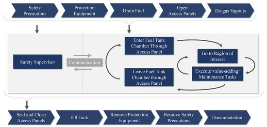 In Figure 3, the theoretical process chain for fuel tank maintenance is illustrated. The respective process information was derived from the AMM of an Airbus A320 and expert interviews with Lufthansa Technik. The context where the tasks are executed varies depending on the operating conditions. For commercial civil airlines, the tasks are usually executed within the context of a heavy check. Notably, these steps could in some cases be stretched over the whole period of a heavy check, which typically lasts four to six weeks. As of the MPD, the estimated time consumption for a GVI is around eight man hours for one aircraft.