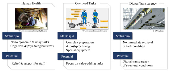 The problem analysis of the fuel tank maintenance process yielded three major needs as shown in Figure 4. The first problem dimension is the human health related aspect. As a working environment for the mechanics, the fuel tanks are inherently dangerous since residual fuel fumes are present (Effects from exposure to residual fuel fumes such as dermatological diseases or increased cancer probabilities are described in [7,8,9,10].). Additionally, the dark, narrow and uncomfortable environment can lead to stresses, as an interview with a former mechanic has shown. These influences can eventually lead to lower concentration levels during the arduous maintenance process and may result in overseeing defects. Thus, relieving the mechanics from these restrictions can increase the safety not only for the mechanics but also for the aircraft itself, since defects are more likely to be detected when the tasks are performed in a more comfortable and human-friendly environment.
