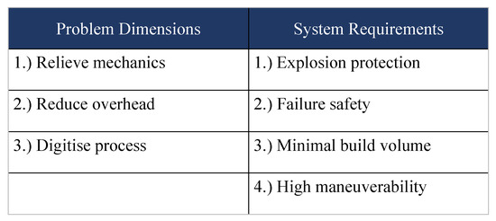 As a consequence of the previously mentioned needs, this section will define specifications and requirements that a respective assisting system should provide to overcome the existing problems. As of Figure 5, the specification sheet was divided into the problem dimensions of the existing maintenance process and the system requirements that apply to the novel assistance system.