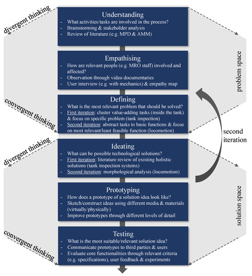 As the overarching objective of this work is to address relevant problems towards digital aircraft fuel tank maintenance through the development of tailored solutions, a corresponding methodical and structured guideline is essential. Thus, an approach was adopted based on the process of Design Thinking, which describes a user-oriented, multidisciplinary framework for achieving desirable and innovative products iteratively through problem and solution stages [14]. Among innovation frameworks such as the stage-gate process or the V-model, the concept of DT generously provides various methodical possibilities for creative collaboration and learning in uncertain and complex environments. Therefore, a respective six phase procedure based on the DT model of the Hasso–Plattner Institute was applied while using different methods and techniques in each phase [15,16]. By considering this basic model, a structured but adaptable and dynamic framework leading to innovative solutions was expected.