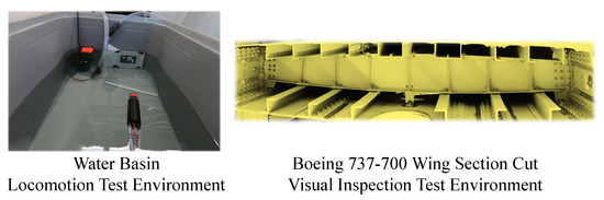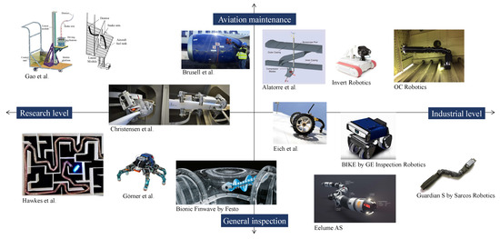 Therefore, the technology scanning was clustered into two dimensions, as can be seen in Figure 7. On the horizontal axis, the systems are classified regarding their technology readiness level (TRL) to illustrate whether a technology would be available in short term or is still in an early stage of research. The vertical axis is instead displaying the intended use and distinguishes between aviation specific inspection systems and general industrial inspection applications. This overview provides only a subset of all the existing systems. The upper right section is considered to be the most relevant area, with systems that could potentially support the maintenance process. Here, the work from Anscombe et al. [19] of OC Robotics is very promising, since they designed a continuum robot for use in aircraft wing production and inspection. Continuous or hyper redundant systems are particularly good for aircraft wings, as this environment is very narrow and holds challenging conditions to avoid collisions while moving. Specifically, the work of Gao et al. [20] is addressing the process of aircraft fuel tank inspections, while also making use of a continuum robot structure. In contrast to OC Robotics, this work holds a comparatively low readiness level. A further robotic inspection and repair system was developed by Alatorre et al. [21] and Wang et al. [22]. Here, a continuum robot structure is used for in situ repair of jet engine turbine blades. In addition to the field of aircraft inspections, Brusell et al. [23] and Invert Robotics have demonstrated robotic application regarding exterior inspections. A rather novel approach was developed by Hawkes et al. [24]. This research group is developing vine-like robots that locomote through growth. This approach yields a high degree of maneuverability even in hardly accessible areas, due to its flexible shape. Bionic inspired systems such as the Finwave [25] were introduced by the Festo company. This fish-like system can dive through pipes for inspection purposes. Within the project of Christensen et al. [26], the use case of ballast tank inspection for large ships was considered. As a solution, they introduced a rail guided system that is routed through the entire ballast tank to reach any area within the tank. Commercially available solutions such as the crawler BIKE from Waygate (formerly GE Inspection Robotics) [27], the diving system from Eelume AS [28] and snake robot from Sarcos Robotics [29] are mainly used for inspections in the oil/gas and infrastructure sector. Furthermore, current research is also developing systems such as crawlers from Eich et al. [30] or Görner et al. [31]. These systems are more focused on the locomotion aspect but could potentially be fitted with sensors.