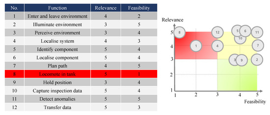 Figure 8 presents the abstract basic functions as well as the visualized results of the relevance and feasibility assessment. It can be seen that the function locomote in tank implied the highest relevance and least feasibility for tank inspection, due to the physical and process-related restrictions associated with the complex tank structure. Consequently, the problem statement was adjusted to locomote in tank.