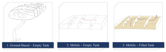 The first sketch on the left represents the approach that is the closest adaption to the current process. Here, a (kinematically redundant) robotic arm will access the empty tank from the access panels. On the one hand, this will lead to reduced working time in the tank for the personnel, but on the other hand the time-consuming disadvantage of opening every access panel remains. Furthermore, tank structures are a highly complex environment to navigate through, which makes a very dexterous robotic arm necessary. Hyperreduntant robotic arms such as [19,32,33,34] could potentially execute those tasks. The second approach that was derived is a mobile system that can drive or crawl through an empty tank. The difference of only opening a specific entry port adds the benefit that most of the access panels could stay closed, what saves time. Nevertheless, this approach requires a highly sophisticated locomotion technique and relatively small dimensions to traverse the openings in the ribs between two tank chambers. Potential systems could be similar to [29,31,35,36,37]. The third option that was sketched is a submergible endoscopic system that could locomote respectively dive through a filled kerosene tank. Inspiring works are [28,38,39]. This approach yields many advantages such as saving time to drain the tank or opening access panels. Additionally, it could potentially be easier to handle in the context of robotic locomotion as such a system can float intrinsically. However, this approach would ask for a very strict explosion protection as kerosene is an explosive medium.